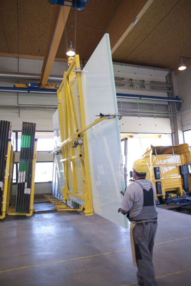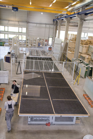 Automatische Schnittlinie, die in der Lage ist Rohgläser bis zu 6000 x 3260 mm von jeder Glasart mit einer Glasstärke von mindestens 2 mm bis maximal 10 mm zu bearbeiten.